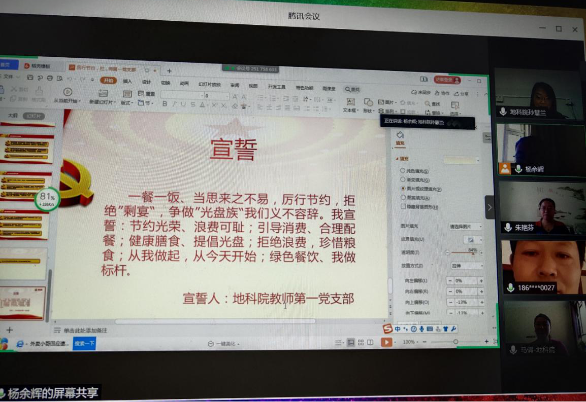 按照学校党委组织部及学院党总支要求,9月16日下午18:00,在太阳成集团tyc33455ccwww教师第一党支部书记的带领下,开展了“厉行节约、杜绝浪费”主题党日活动,党日活动通过专题学习、“厉行节约、杜绝浪费”主题集体宣誓等形式开展。