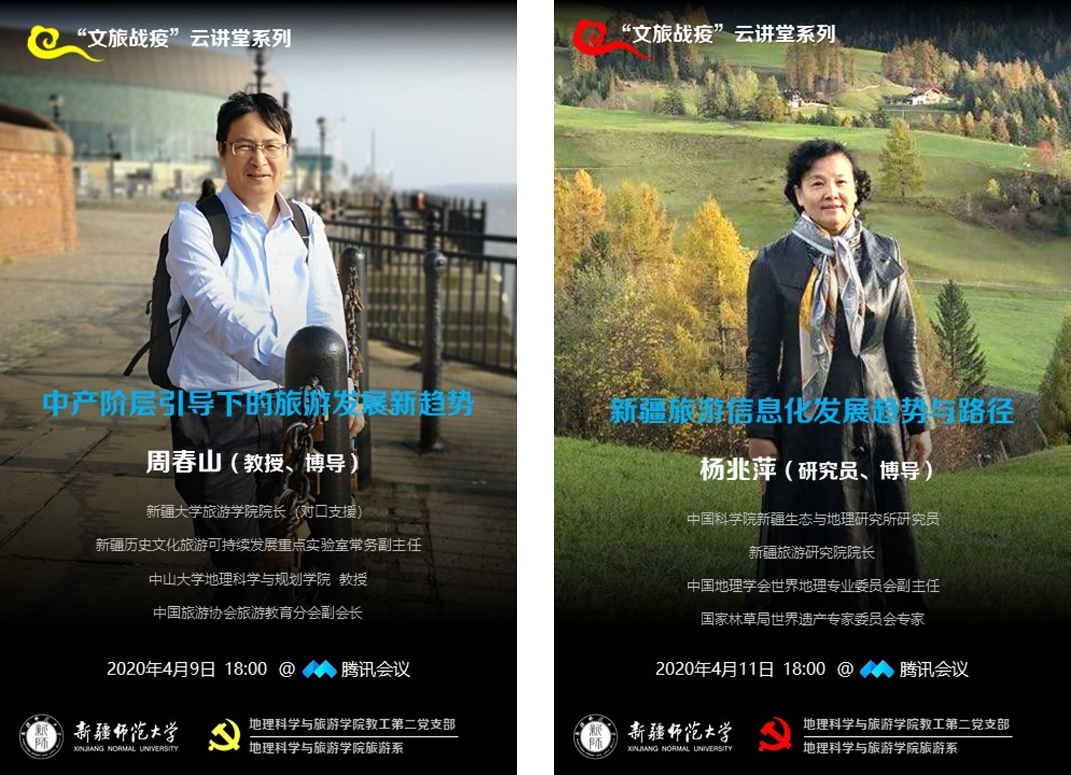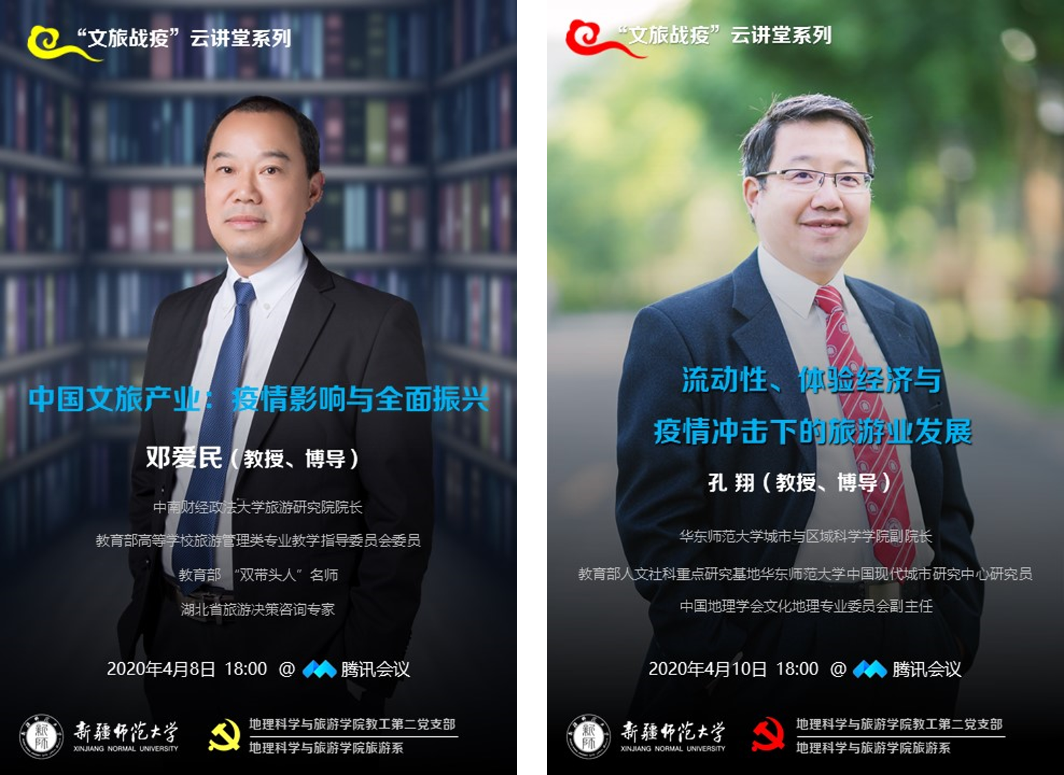 对于高校教师、学生而言,做好疫情期间的教育教学工作。科学落实停课不停学,把疫情对学生对教学的影响降到最低,太阳成集团tyc33455ccwww教工第二党支部和旅游系结合专业特色发起了“文旅战疫”云讲堂活动,邀请文旅大咖从不同的视角为旅游管理专业师生解读“战疫”之后文旅产业的应变之道。应邀参加此次活动的专家有中南财经政法大学旅游研究院院长、教育部“双带头人”、教育部高等学校旅游管理专业教学指导委员会委员邓爱民教授;新疆大学旅游学院院长、新疆历史文化旅游可持续发展重点实验室常务副主任、中国旅游协会旅游教育分会副会长周春山教授;华东师范大学城市与区域科学学院副院长、教育部人文社科重点研究基地研究员、中国地理学会文化地理专业委员会副主任孔翔教授和新疆旅游研究院院长、国家林草局世界遗产专家委员会专家、中国科学院新疆