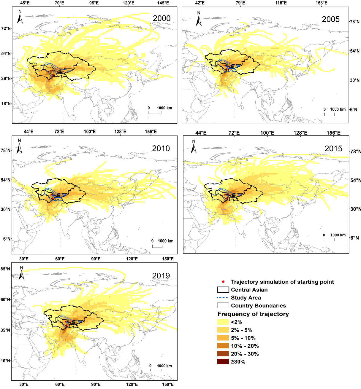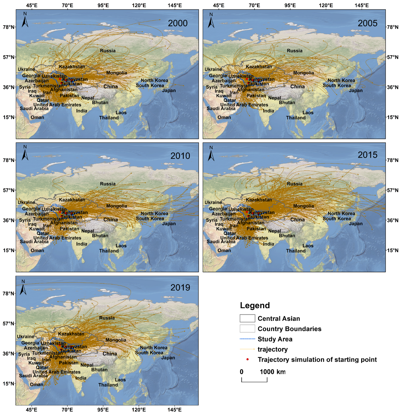 研究结果表明,2000-2019年咸海流域防风固沙量总体呈现上升的趋势。高值区主要分布在咸海流域的西部,以卡拉库姆沙漠最为显著。防风固沙服务流动路径主要向东北、西南方向流动。高频受益区主要分布在乌兹别克斯坦、吉尔吉斯斯坦、哈萨克斯坦南部及阿富汗西部地区,轨迹分布频率呈现出由中心向外围圈层式递减的趋势。总体来看,中亚咸海流域防风固沙服务受益区内草地面积最大,受益人口与受益real GDP均呈现出增长的趋势。这项研究将为咸海流域水土保持研究和区域水资源合理利用提供一定地理论指导,也可为联合国可持续发展目标的实现奠定基础。